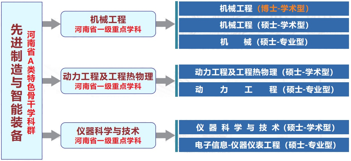 学院依托先进制造与智能装备河南省A类特色骨干学科群和机械工程、动力工程及工程热物理、仪器科学与技术等三个河南省一级重点学科,设有1个机械工程一级博士学位授权点及机械工程、仪器科学与技术、动力工程及工程热物理3个一级硕士学位授权点,拥有机械工程博士后科研流动站,同时设有机械、动力工程领域、电子信息(仪器仪表工程领域)3个专业硕士学位授权点。