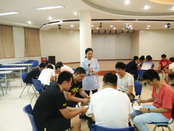 经过精心准备,张科首先带领学生们通过特殊的方式进行自我介绍,并互相认识;然后分组,在自己制作的小书上写下自己的征服体验,在小组内分享之后大组进行分享;接着张科让学生们写下自己的十大优秀品质,进行小组和大组分享。